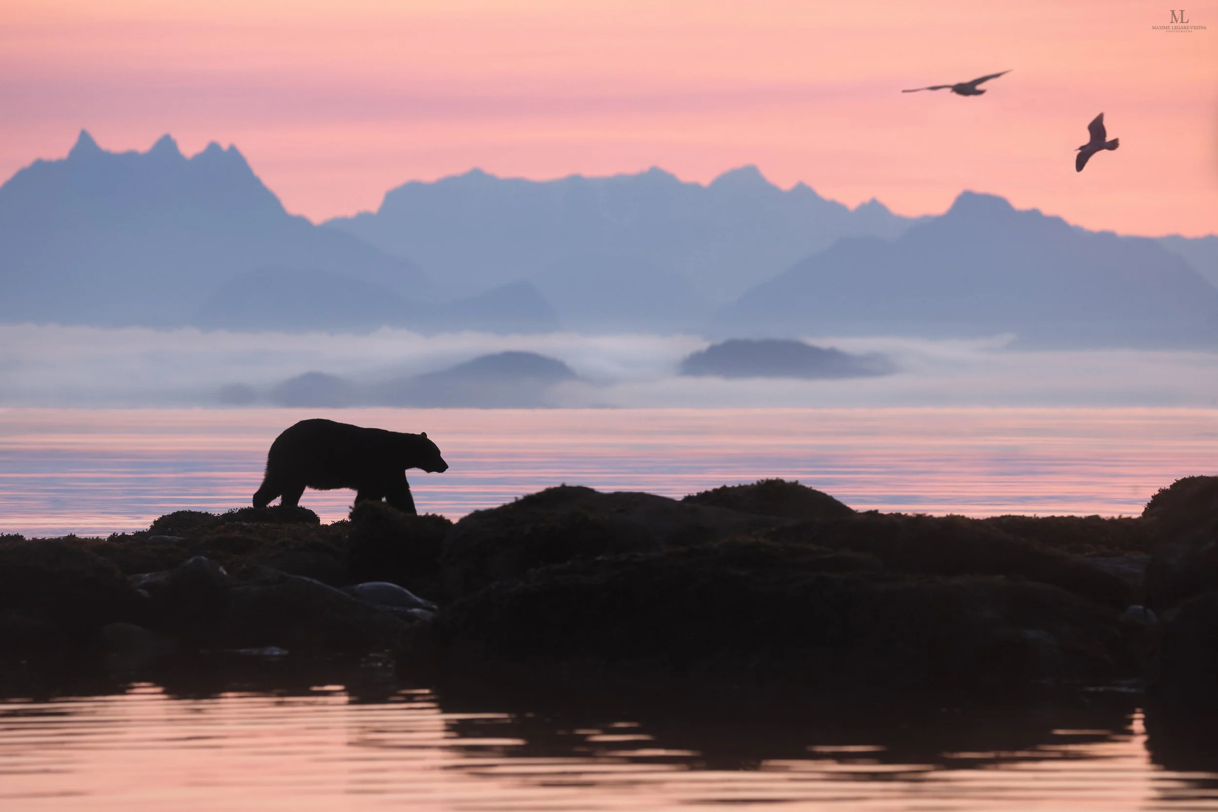It was very early in the morning, about half an hour before sunrise. I was walking along the beach toward the river where the bears go to fish for salmon when I spotted its silhouette set against the most beautiful scenery imaginable. Mountains in the background, sea mist, a pink sky and, to top it all off, seabirds.