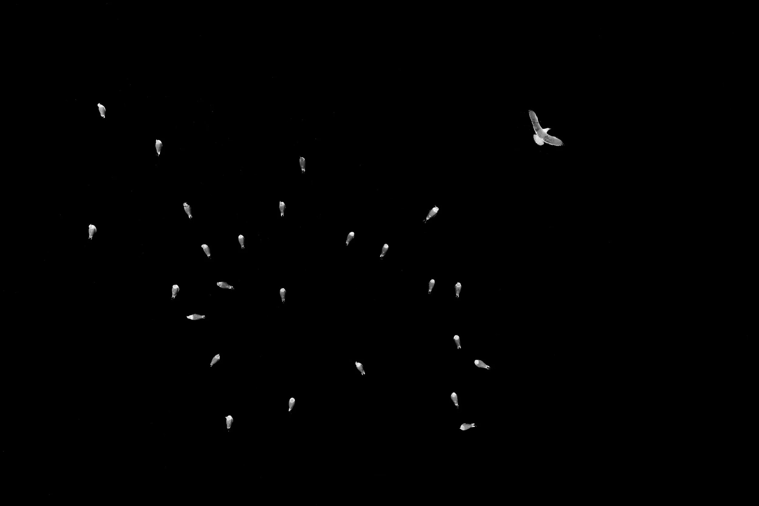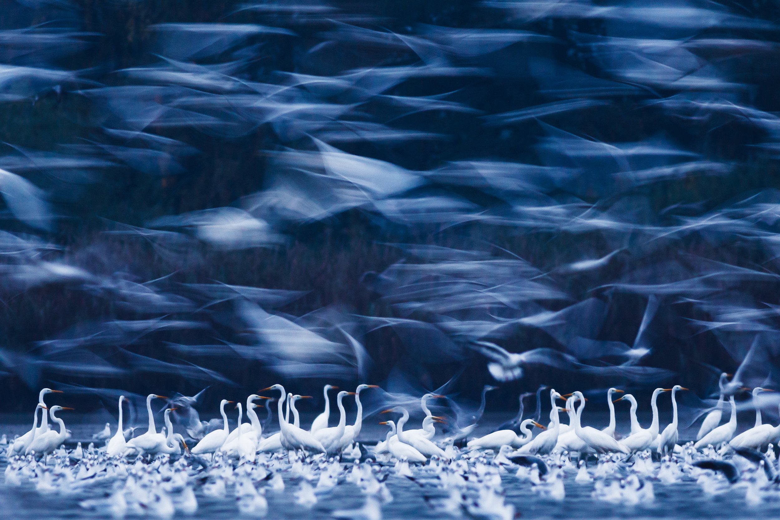 When fish ponds are being drained, thousands of birds gather for easy prey. While I was photographing these great egrets and gulls, a white-tailed eagle appeared all of a sudden. The gulls panicked while the egrets just froze and did not move. Using a long shutter speed, I managed to capture this fleeting moment.