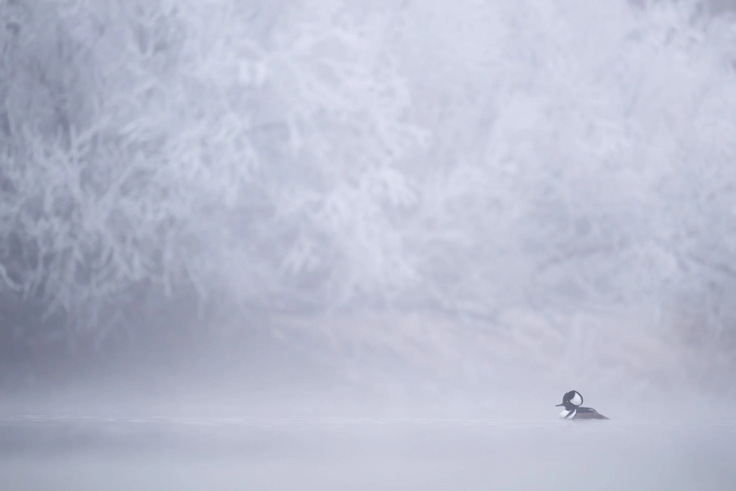 I immediately noticed the empty parking lot as I pulled in, likely thanks to the well-below-freezing temps. The lake before me was frozen over, with a portion of open water creeping out from a nearby river. The conditions appeared to congregate the local wildlife into a small area. Waterfowl scattered as I made my way down the bank of large boulders. For the next hour, I found myself hunched over, with my lens just above the water, photographing anything willing to wade by. A Hooded Merganser was the one who gave me the best looks. The merganser moved smoothly, back and forth, through the fog, water, and frosty background. After 10 years of photography, I had just gotten the first duck photo I was pleased with. I couldn't help but chuckle at the reminder that the environment often dictates a photo more than the actual subject.