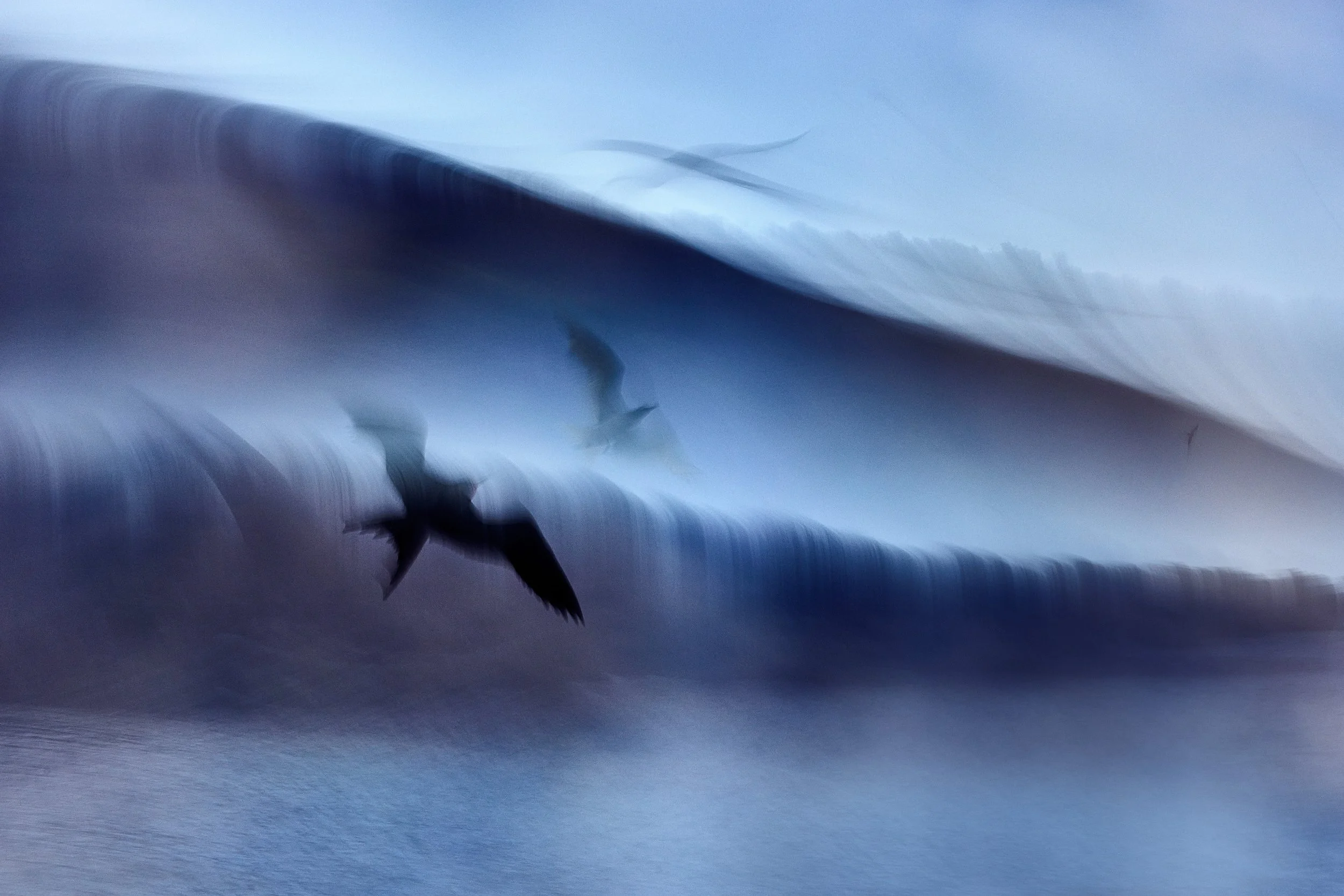 Seabirds sweep along the Galápagos coastline as the Pacific swell breaks below. I used a slow shutter and intentional camera movement to translate the speed of the flight and the restless motion of the sea, keeping the feeling of the moment rather than freezing every detail.