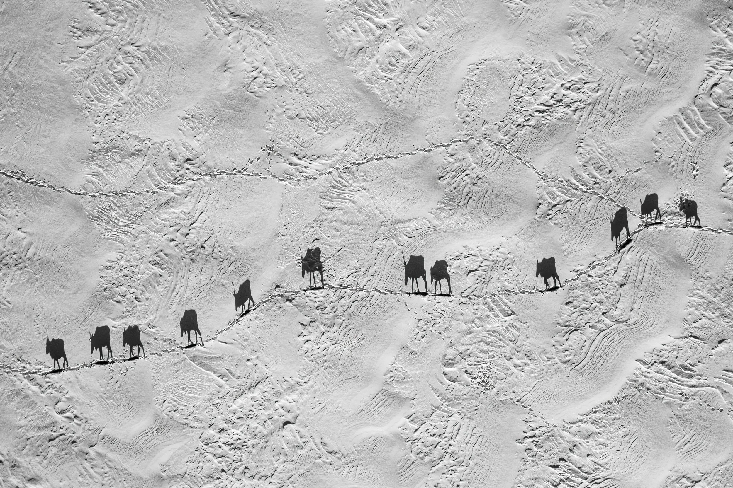 A group of caribous braving the harsh winter conditions of Northern Quebec while crossing this frozen lake, as seen from the sky.