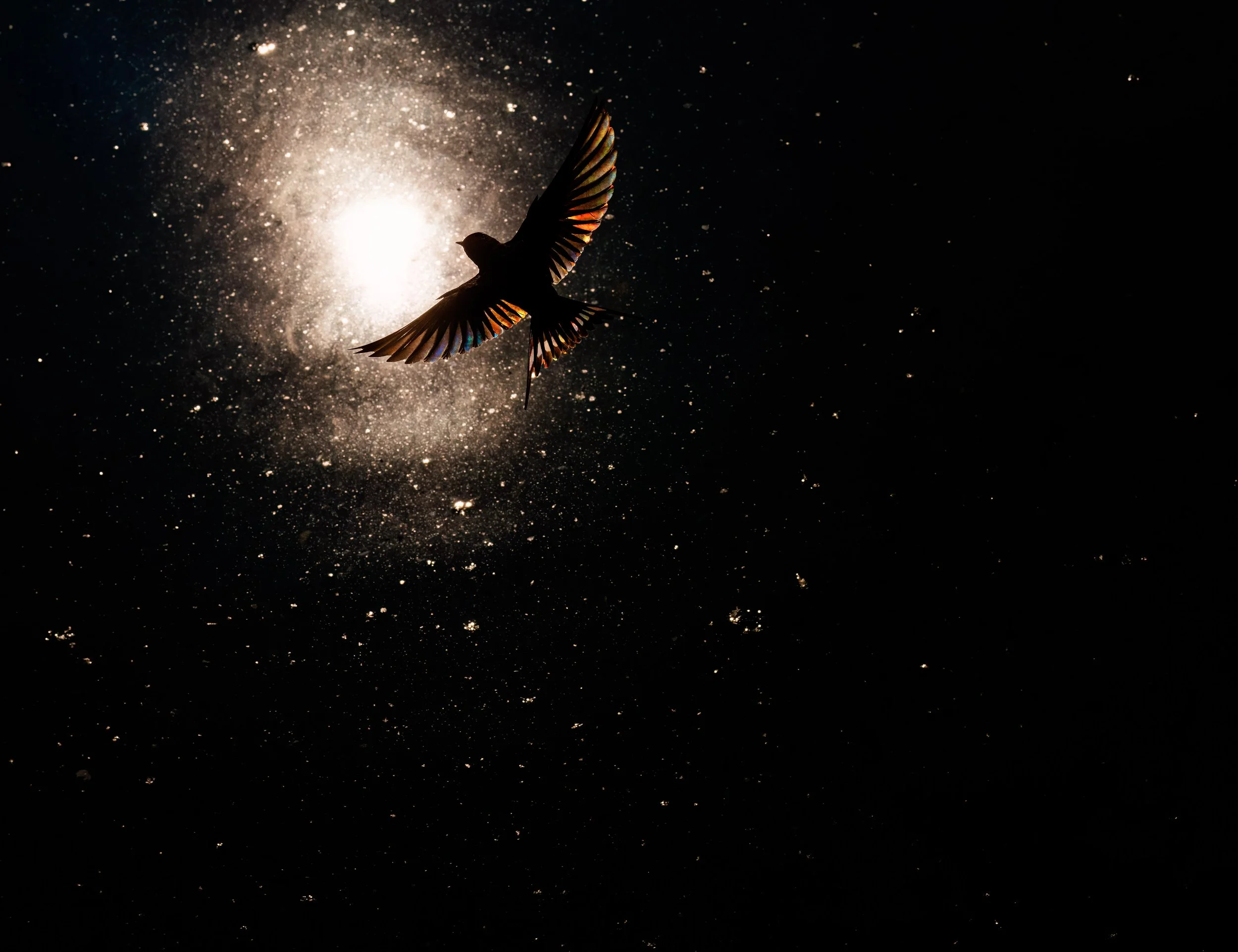 I often joke that swallows move at "warp speed," seeing them more as space travellers than birds. This inspired a photographic project: capturing a swallow in a scene resembling outer space. I found my location at an urban park marina bridge. By intentionally underexposing the reflective water, the sun’s reflection became a giant star, while specs of plastic and plant life transformed into pinprick stars, creating the perfect cosmic backdrop.