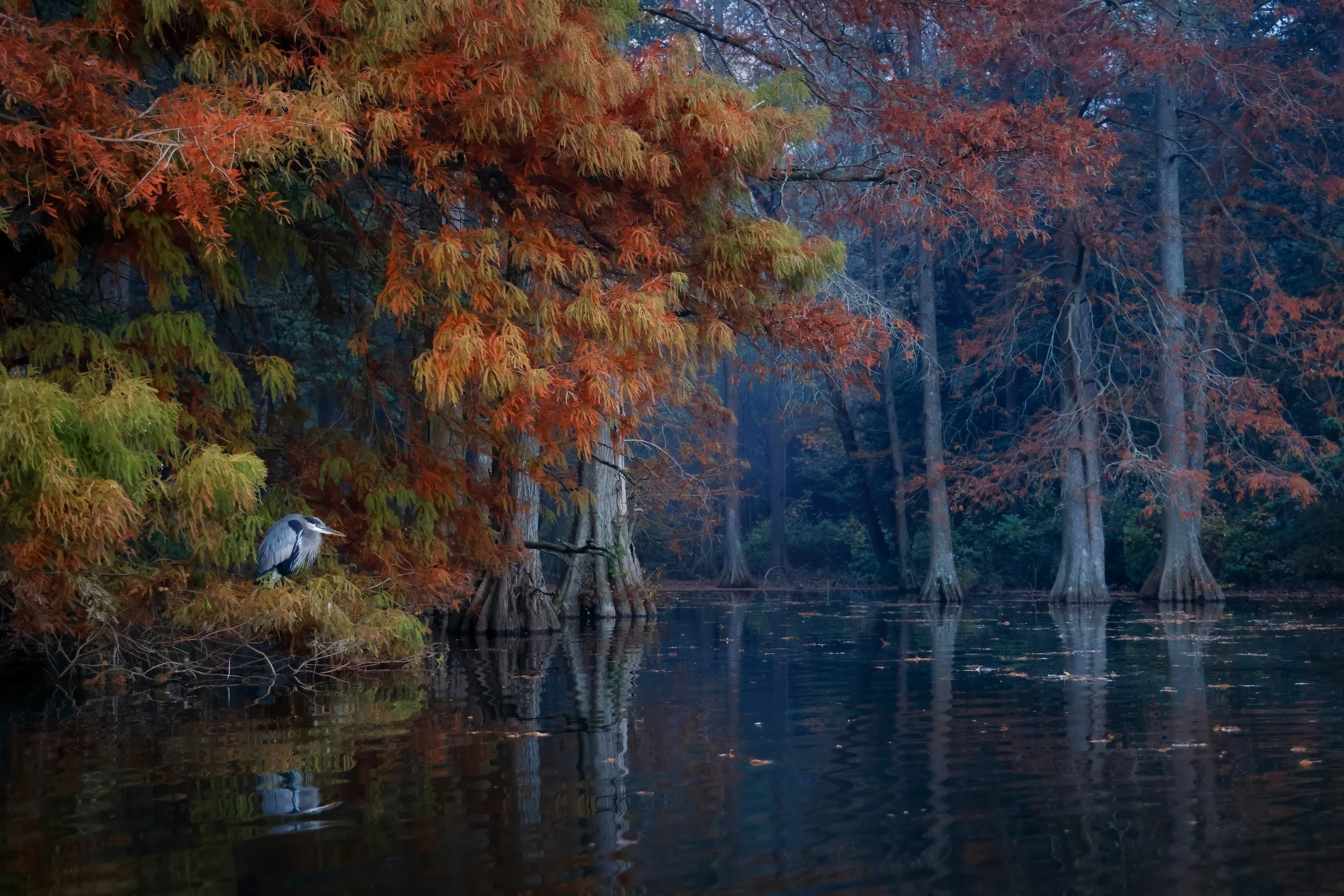 A Great Blue Heron perches near the shoreline of North America’s northernmost Bald Cypress swamp. I took this image at dusk from my kayak during the peak of Fall color. A 50mm focal length was used to allow for an expansive scene to show the bird’s environment, while not diminishing the subject in the frame.