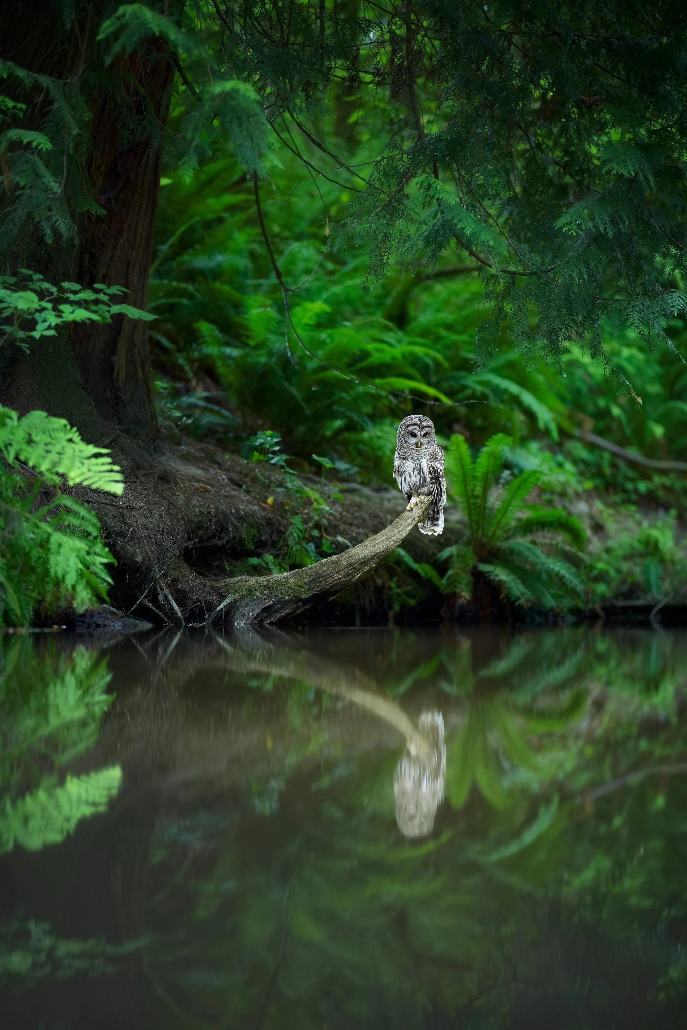 A barred owl perches quietly above a calm forest creek, enveloped by layers of lush green. As it glances downward for a fleeting moment, its reflection shimmers in the still water below—creating the illusion of quiet contemplation. For an instant, the forest seems to pause, as if both owl and creek are reflecting on the life unfolding around them.