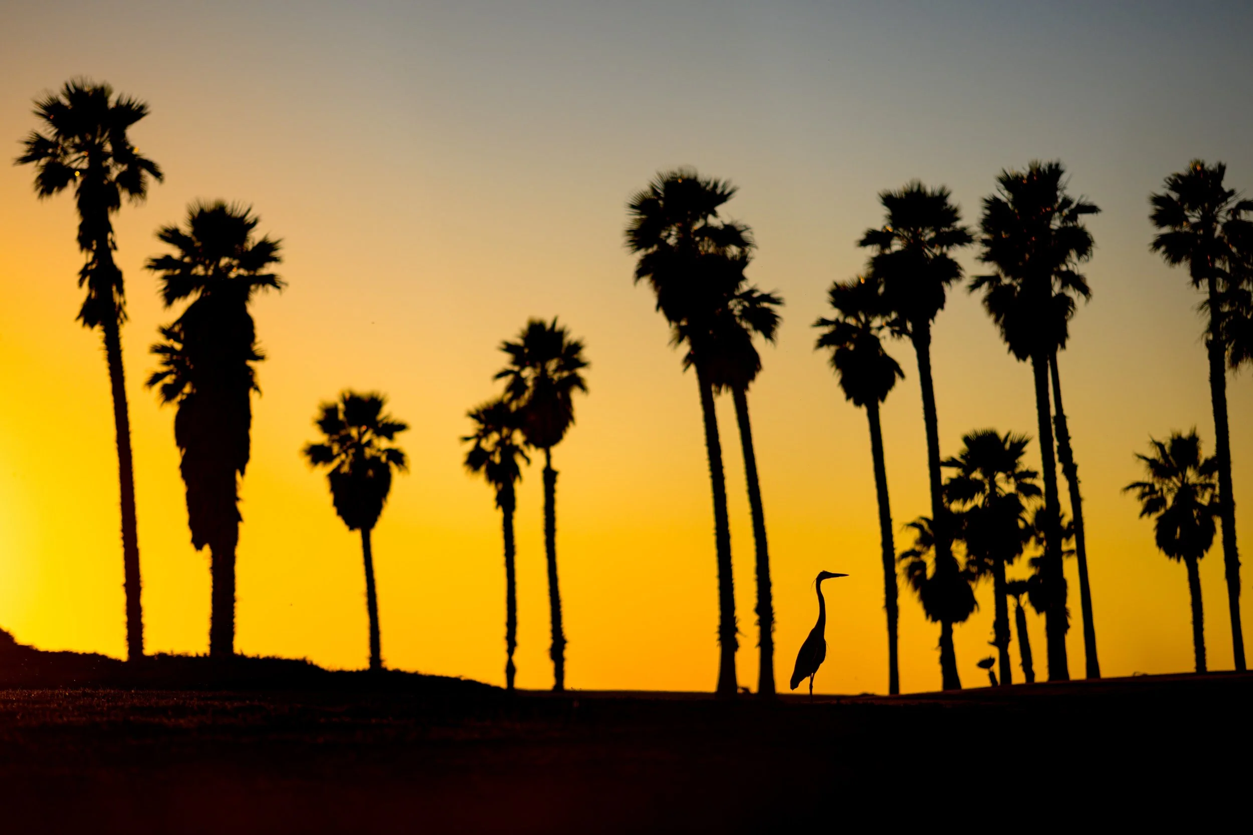 I was fortunate to be able to visit Oxnard, California in February 2026 for several weeks to escape the cold Chicago winter and play some beach volleyball. I took my camera out several evenings to a beachside park lined with palm trees, where I consistently found a lone great blue heron intently focused on the grass. A passerby told me that it had used this area for years as a hunting ground for gophers. I captured this silhouette one evening several minutes after sunset on my way back from the beach.