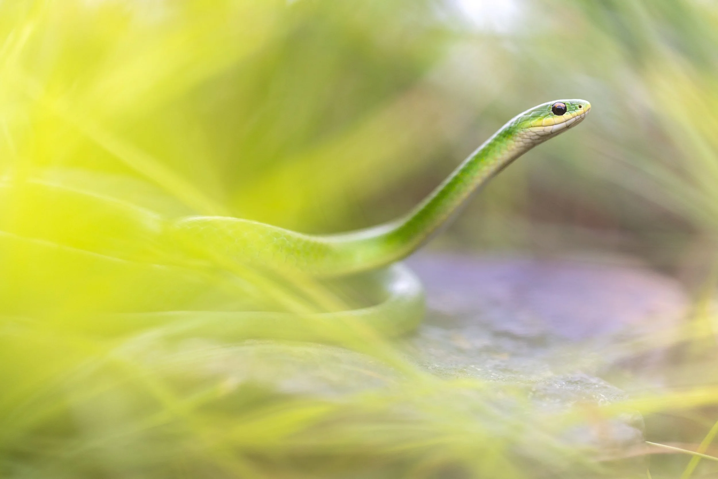 A smooth greensnake found basking between vegetation patches in a West Virginia cow pasture.