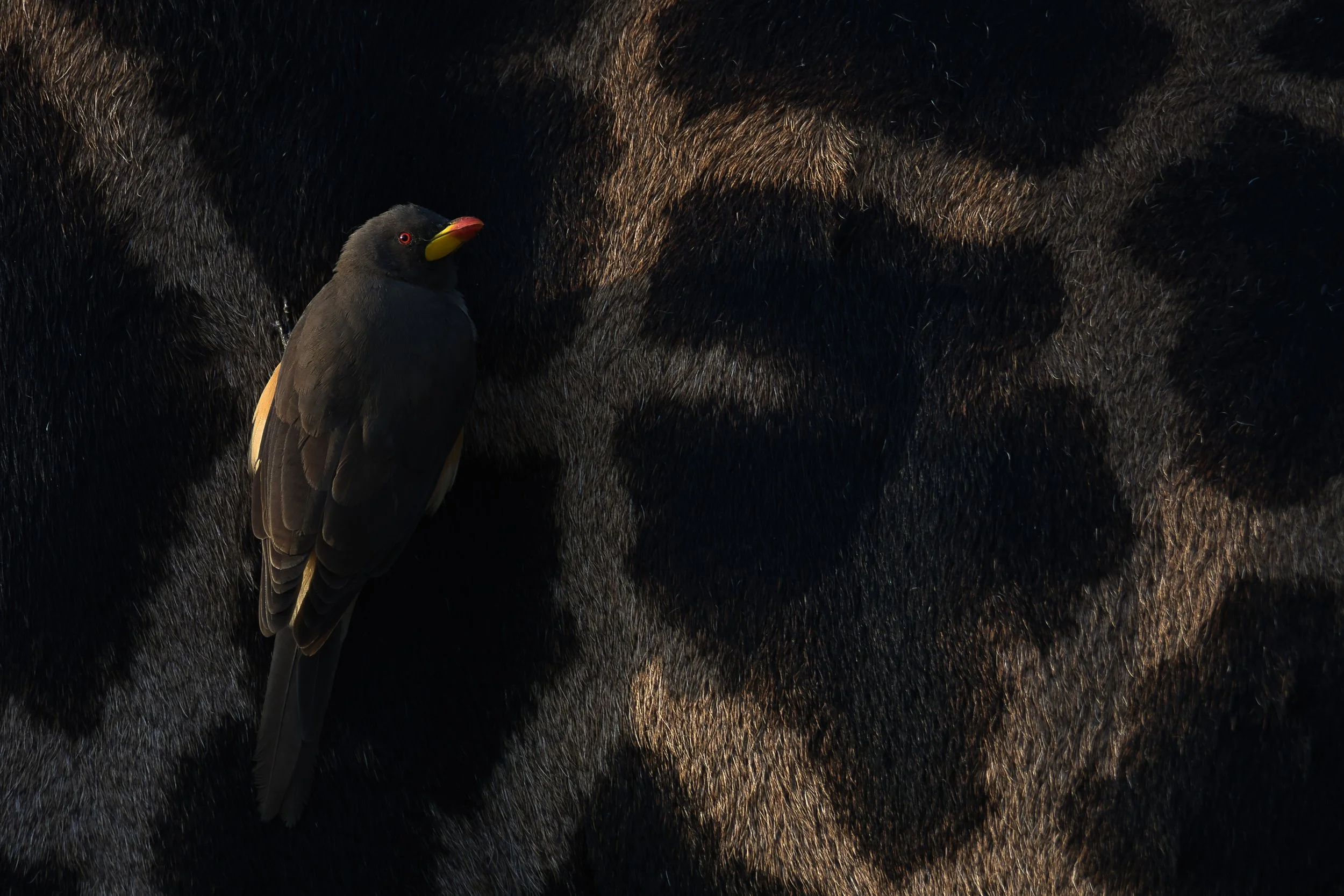 A yellow-billed Oxpecker perched on a masai giraffe in the early morning light